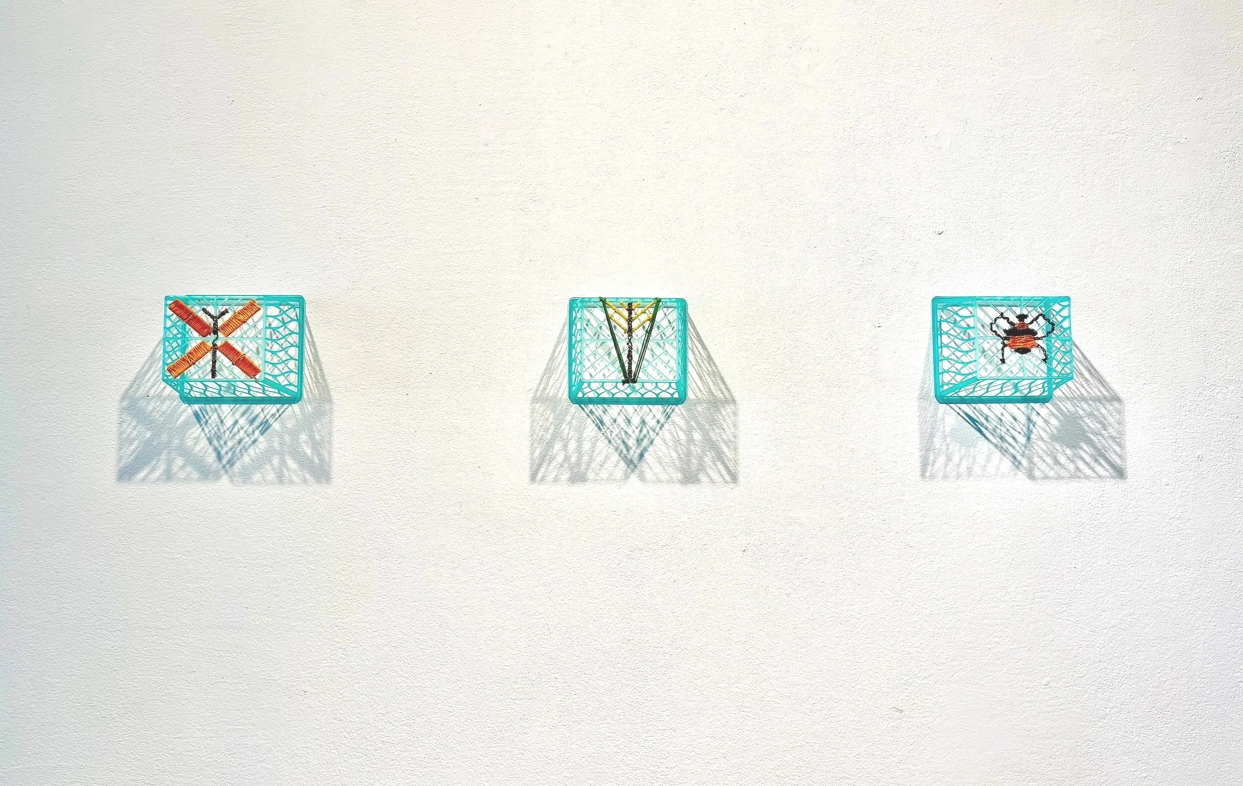 This work uses small green plastic fruit bins as both material and metaphor, reflecting on the ecosystems that sustain life. Hand-embroidered symbols—butterflies for migration, corn for agriculture, and bees for labor—are stitched into each bin, elevating these overlooked objects into vessels of meaning. The piece honors the unseen forces and fragile systems that nourish humanity, reminding us that even the smallest elements carry power, purpose, and life-giving potential.